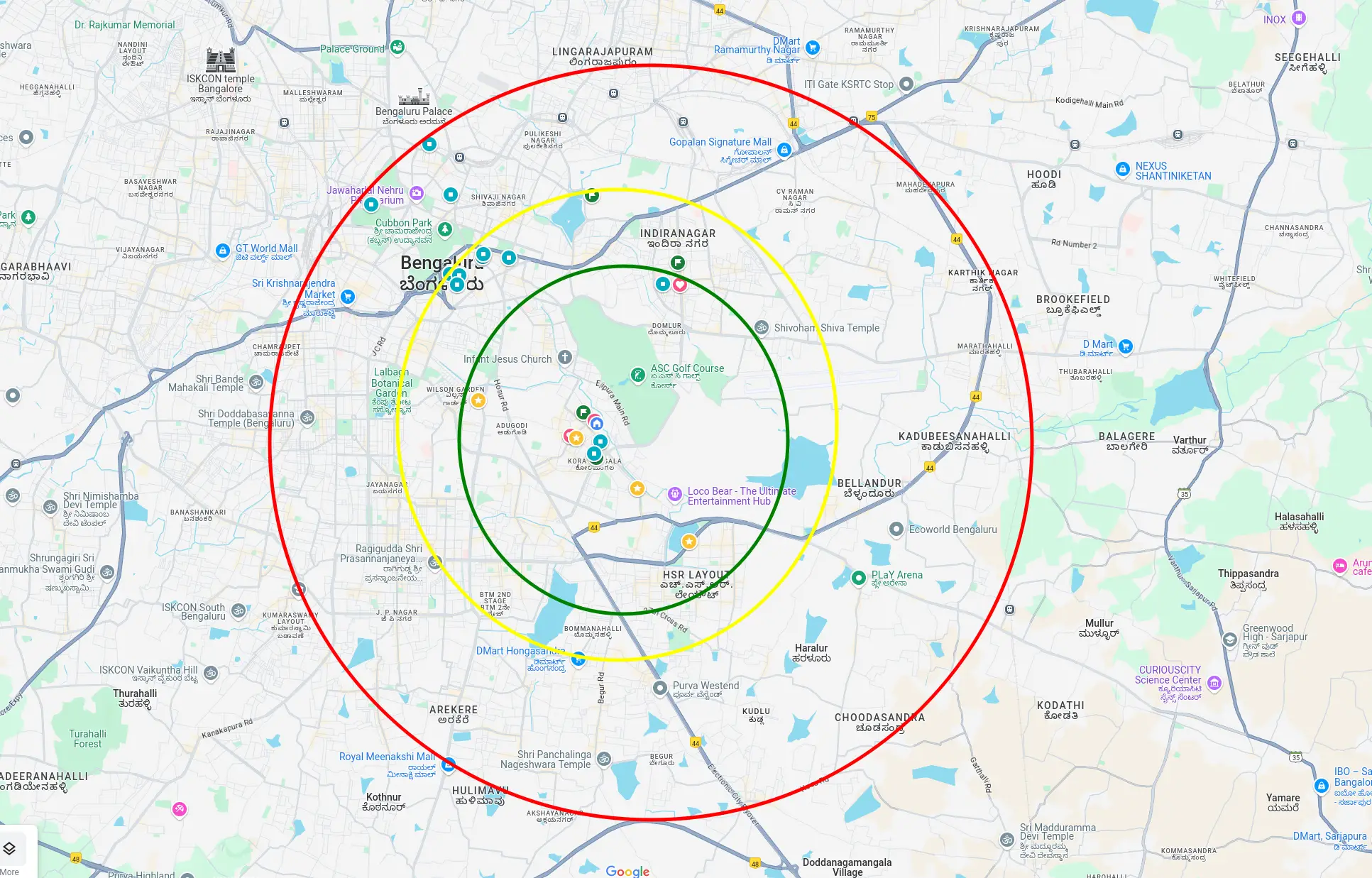- red: you don’t want to stay outside of this area in most circumstances. traffic in bangalore sucks, it’s true. we’re not here to whine about that, we’re here to make most of the city as it stands